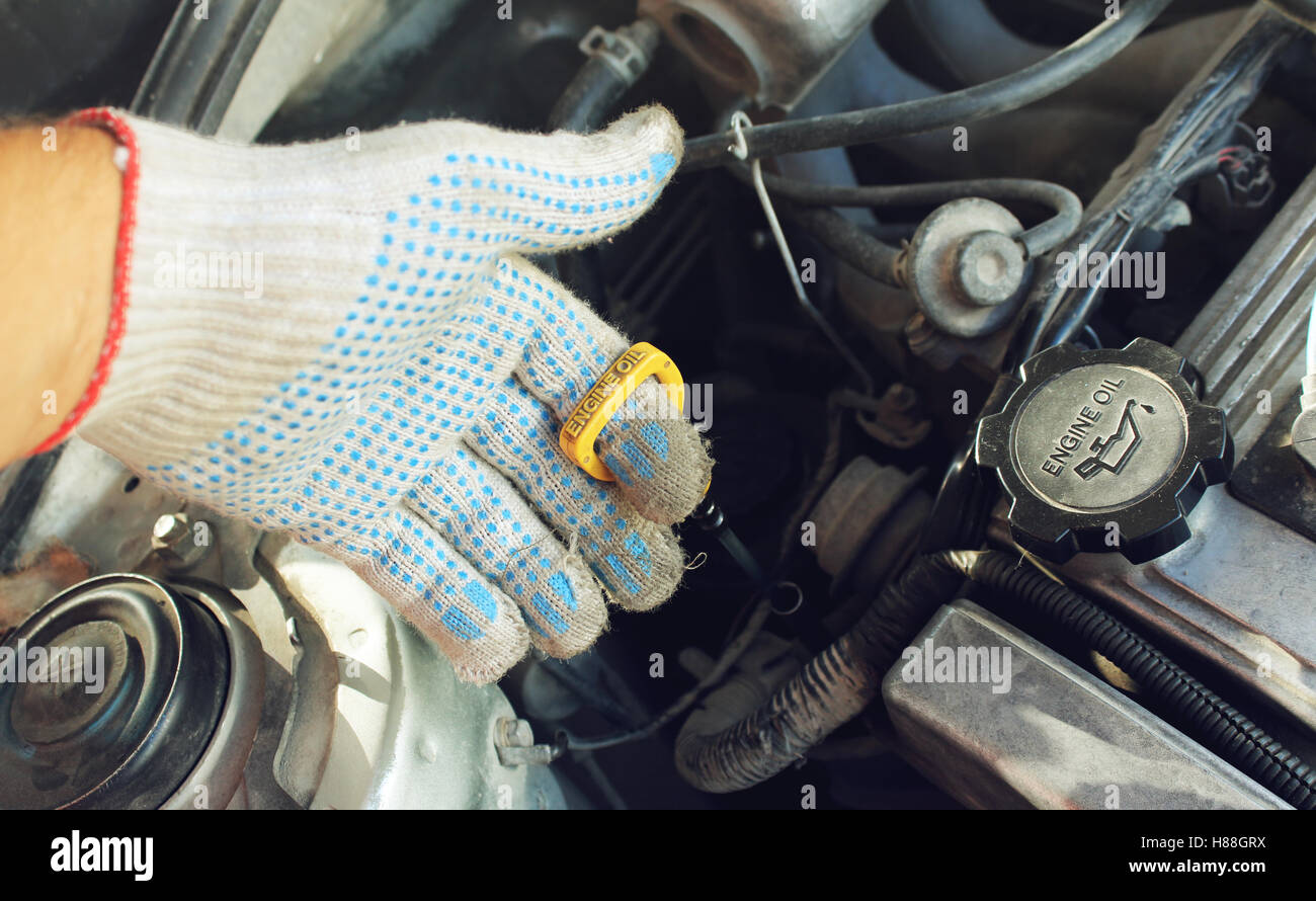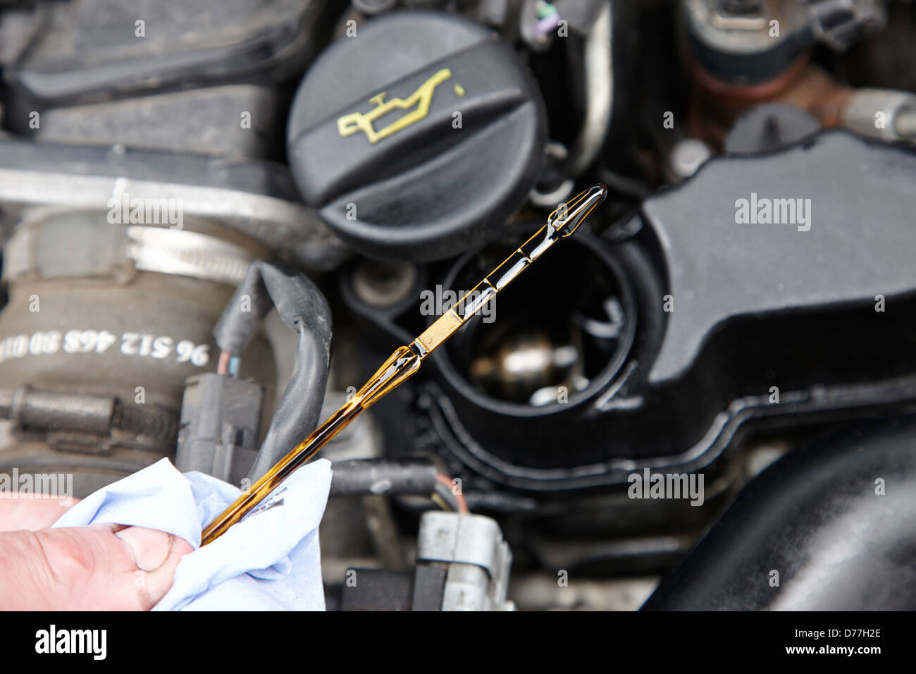 La varilla indicadora del nivel de aceite del coche en una mano Fotografía de stock Alamy