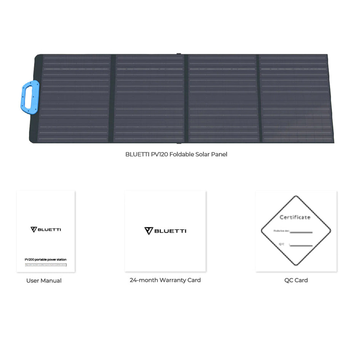 Description. Specifications. Reviews. Bluetti 120 watt Solar Panel PV120. This is a high efficiency solar panel with much better power output than similarly rated solar panels. Matches well with all portable power packs capable of accepting at least 120w. Monocrystalline Solar Cells With Up to 23.4% Efficiency. Foldable & Portable.
