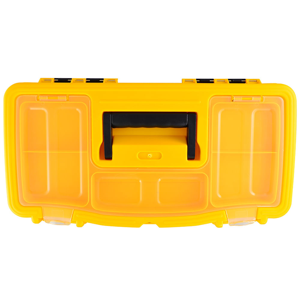 Información del producto. Gran compartimiento para herramientas eléctricas y manuales, bandeja para piezas pequeñas y herramientas de mano, y organizador extraíble. Medidas: Longitud 66 x ancho 28,7 x altura 16 cm. Material: Cierres metálicos.