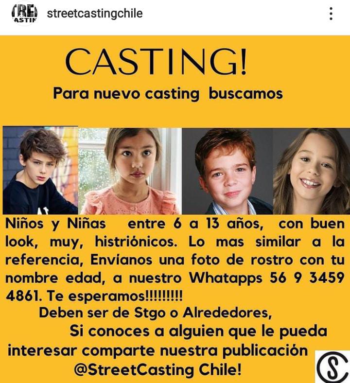 CASTING en SANTIAGO de CHILE Se buscan NIÑOS, NIÑAS y ADOLESCENTES para COMERCIAL entre 6 a 13 años