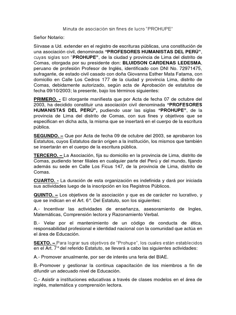 Minuta de Asociación Sin Fines de Lucro PDF Lima Perú