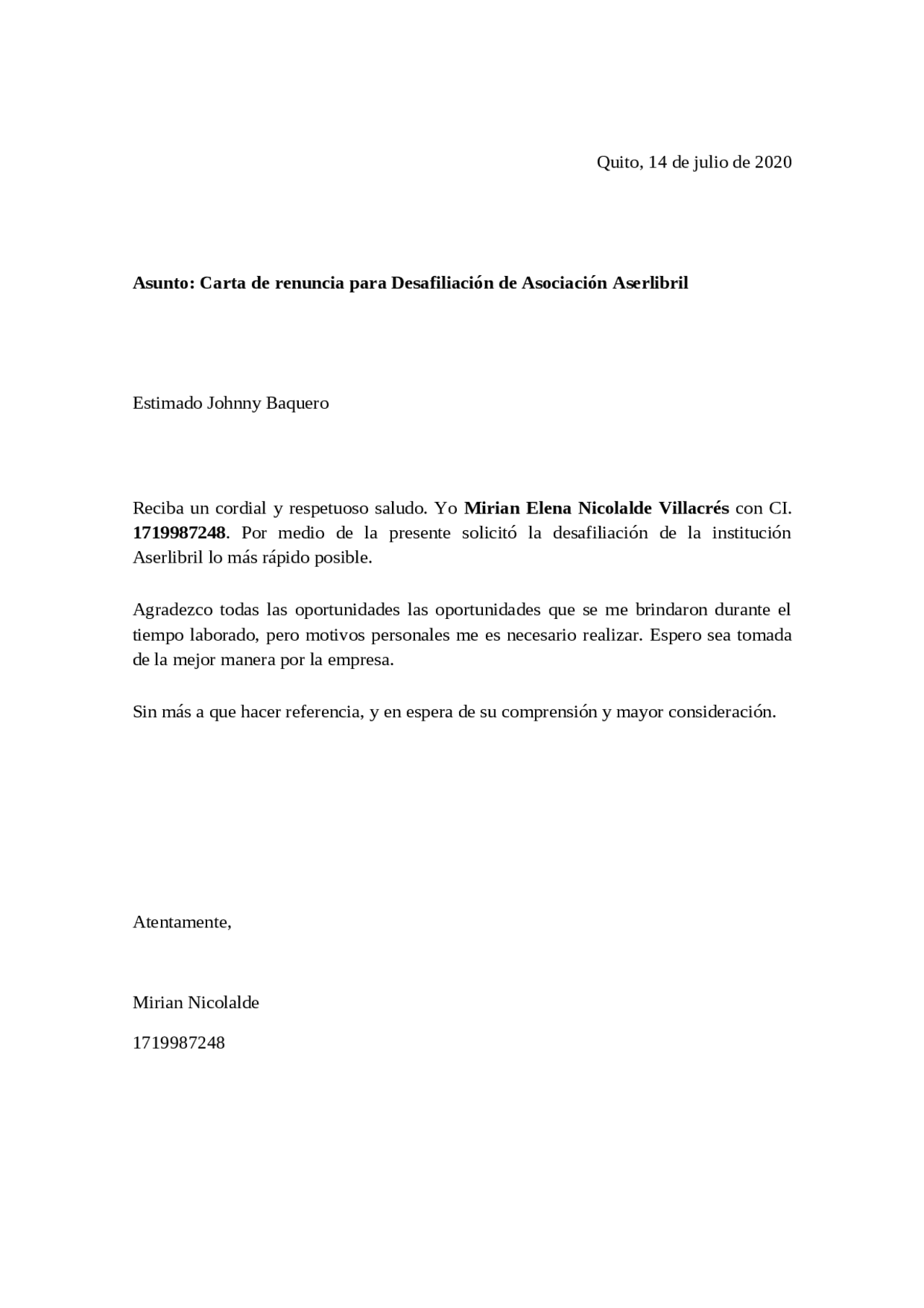 Carta de renuncia de una asociación Apuntes de Lengua y Literatura