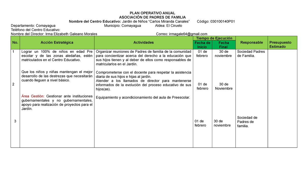 PLAN Operativo Anual ASOCIACIÓN DE PADRES DE FAMILIA Nombre del Centro Educativo Jardin de