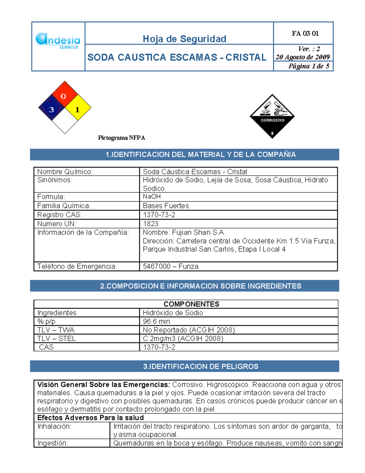 Ficha técnica FA 03 01 Ver. : SODA CAUSTICA ESCAMAS -98.5 % 1 25-oct-2018 Página 1 de 5 0 3 1 Pictograma NFPA 1.IDENTIFICACION DEL MATERIAL Y DE LA COMPAÑIA Soda Cáustica Escamas Nombre Químico: -98.5% Sinónimos: Hidróxido de Sodio, Lejía de Sosa, Sosa Cáustica, Hidrato Sodico. Formula: NaOH