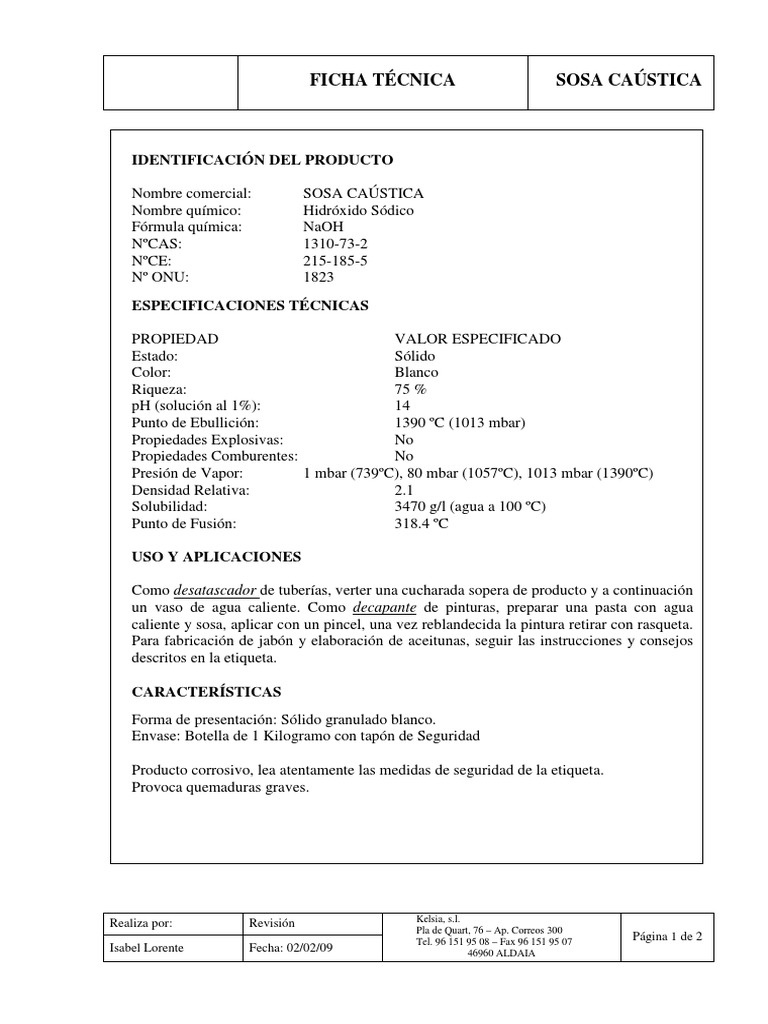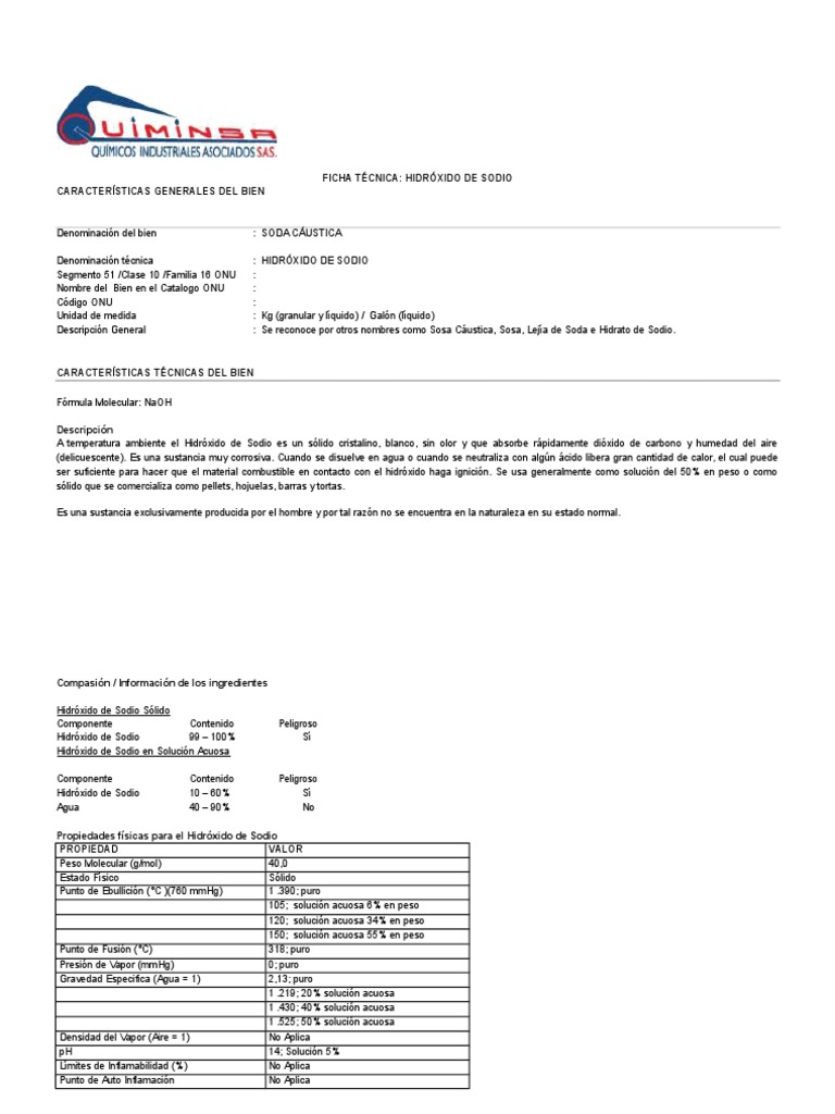 FICHA TÉCNICA SODA CÁUSTICA LIQUIDA 1. IDENTIFICACIÓN DEL PRODUCTO. Sinónimos Soda cáustica Lejia de Sosa Hidrato de sodio 2. DESCRIPCIÓN Todas las soluciones son higroscópicas, fuertemente alcalinas y corrosivas Soluble en agua,. determinar la aplicabilidad de la información consignada en la presente hoja según sus.