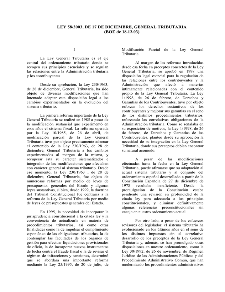 Estructura de la Ley 58/2003, de 17 de diciembre, General Tributaria. La nueva Ley consta de cinco Títulos. Los dos primeros vienen a coincidir esencialmente con los Títulos preliminar, primero y segundo de la Ley 230/1963. Sin embargo, los Títulos III, IV y V de la nueva Ley suponen una estructura más lógica. El Título I, disposiciones.