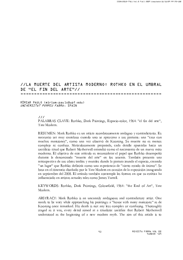 (PDF) LA MUERTE DEL ARTISTA MODERNO ROTHKO EN EL UMBRAL DE "EL FIN DEL
