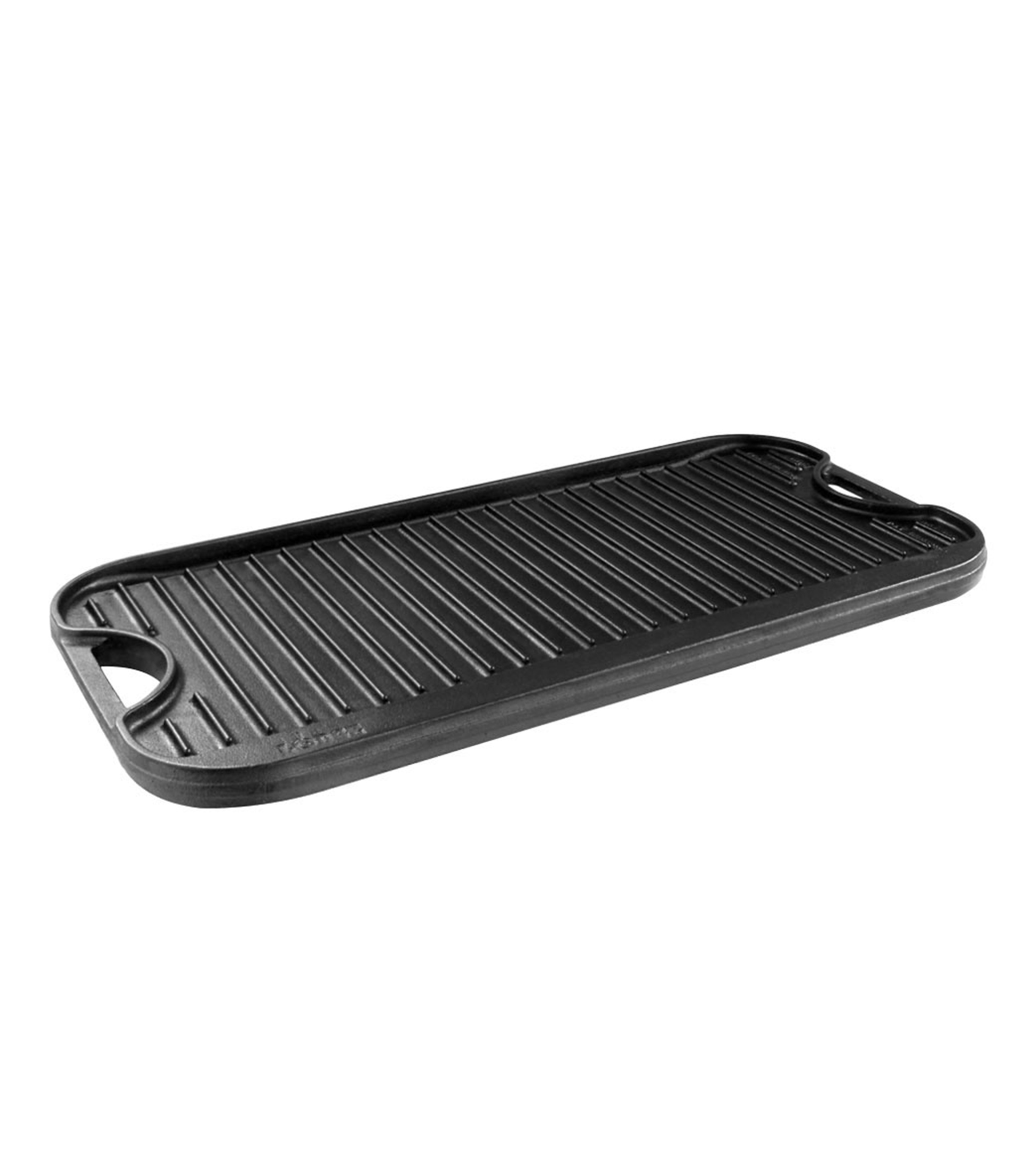 Parrilla | Plancha reversible de hierro fundido curado de 42.54 cm x 24.13 cm | 16.75 pulgadas x 9.5 pulgadas para dos quemadores. La parrilla | plancha reversible de dos quemadores Lodge presenta un lado liso para hacer sándwiches de queso a la parrilla, así como huevos y panqueques. El lado acanalado es perfecto para asar alimentos como bistec, pescado, pollo y hamburguesas.