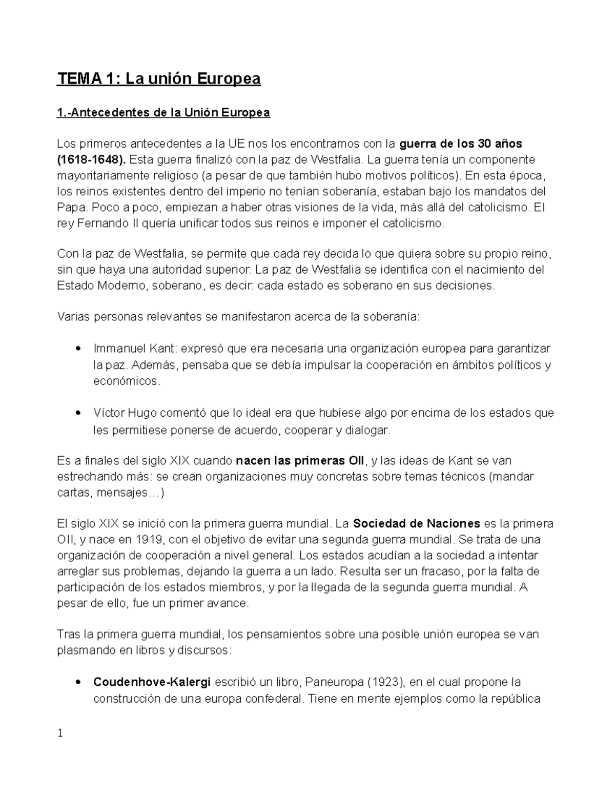 Derecho UE TEMA 1 La unión Europea 1.Antecedentes de la Unión Europea Los primeros