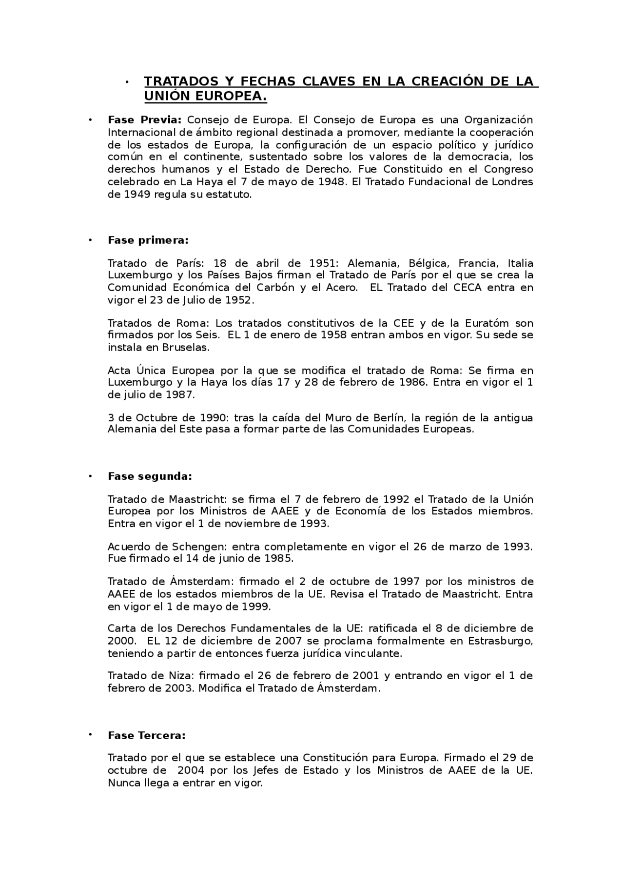 TRATADOS Y FECHAS CLAVES DE LA UNION EUROPEA Apuntes de Derecho de la Unión Europea Docsity