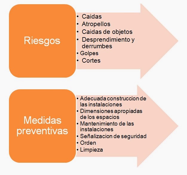 1.1. Riesgos ligados a las condiciones de seguridad. El lugar y la superficie de trabajo: el orden y la limpieza son los principios básicos que propician la seguridad y evitan la mayoría de los accidentes. Herramientas: las mas peligrosas son, martillos neumáticos taladradoras, motosierras, etc. Las principales causas de lesiones son debidas.