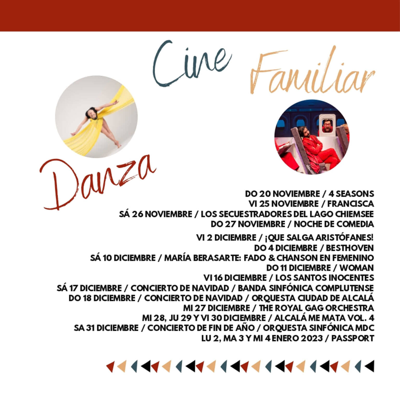 27 diciembre, 2022 por Nieves Zaballos. La programación cultural del Teatro Cervantes de SEPTIEMBRE a DICIEMBRE DE 2022 comienza el 15 de septiembre. Nosotras, tal como hicimos en la temporada pasada, publicaremos un POST RESUMEN SEMANAL para recordaros lo que tendrá lugar en la semana y además, mantendremos el programa COMPLETO para que.