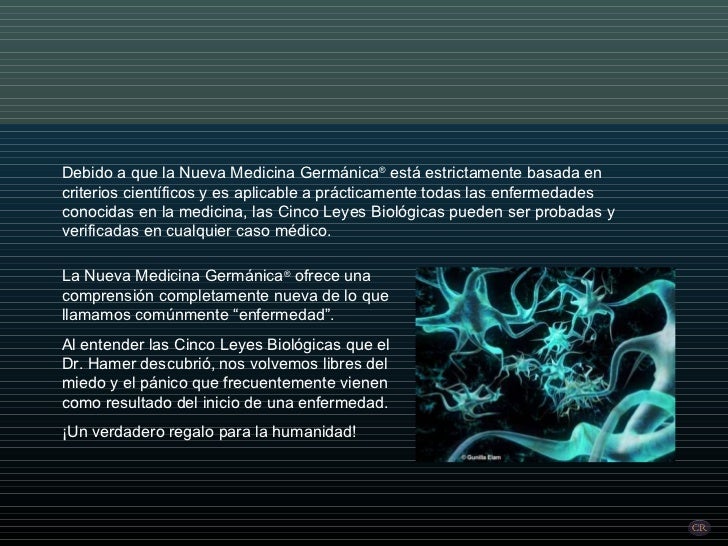 TERAPIA DE LA NUEVA MEDICINA GERMÁNICA Dr. Hamer: "Muchos de nosotros experimentaremos en algún momento o en otro un conflicto y tendremos cáncer, pero después de todo esto es parte normal de la vida, y no una cosa tan mala, una vez que uno comprende los principios de las Cinco Leyes Biológicas. Aún si algunos les preocupa o les afecta el.